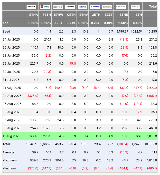 BlackRock’s iShares Ethereum Trust (ETHA) topped the list with $640 million in inflows, while Fidelity’s Ethereum Fund (FETH) followed with $277 million, both setting new daily highs. Other contributors included Grayscale’s Mini Ether Trust with $67 million and smaller flows from Bitwise, 21Shares, Franklin Templeton, and VanEck.