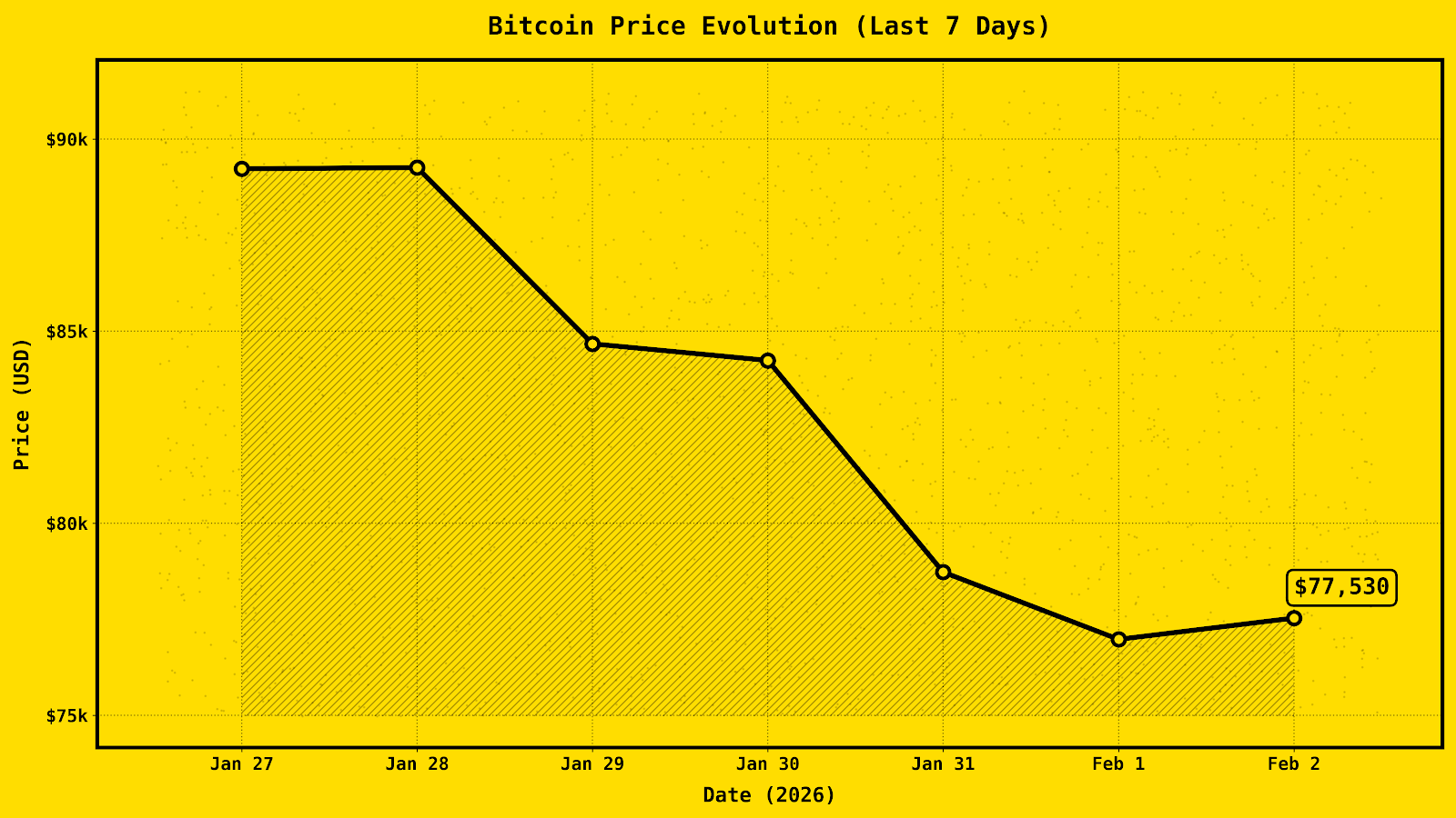 En medio de la recesión, HYPE de Hyperliquid se convirtió en la principal alcista, con un aumento significativo gracias al explosivo volumen de los DEX, lo que la posiciona como una criptomoneda en movimiento que resiste la caída. Entre las criptomonedas con pérdidas se encuentran Ethereum (-6,39%, hasta los 2288$) y Monero (-10,91%), lo que refleja el impacto negativo de las altcoins. Existen oportunidades de compra en criptomonedas principales sobrevendidas como Bitcoin, a 77.139 $, donde la acumulación de ballenas indica posibles rebotes hasta la resistencia de los 80.000 $, y en HBAR, tras una caída del 35%, para su reversión de flujos de entrada. Otras criptomonedas con mayor movimiento, como ASTER, CHZ y AXS, muestran interés de las ballenas por las subidas de febrero. No hay compras claras de bajo riesgo más allá de las caídas, así que aquí está el gráfico de evolución del precio de Bitcoin que ilustra la caída de enero: